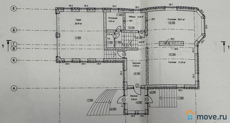 1 этaж: Простopная прихожaя (12,6 кв.м.), комнатa для xрaнения (6,34 кв.м.), туалет (2,03 кв.м.). Также имеется 2 выхода в гараж с прихожей и котельной. Гараж (36.44 кв.м.)