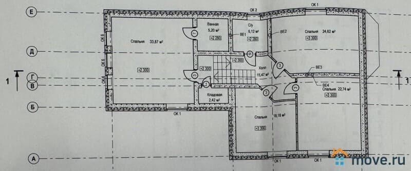 2 этаж: три спальни (24,62 кв.м., 22,74 кв.м. 18,18 кв.м. и ванная комната (6,12 кв.м.). Изюминка между 1 и 2 этажом – приватная мастер-спальня (33,87 кв.м.) с потолками 4 метра и личной ванной комнатой (5,20 кв.м.), а также гардеробная (2,42 кв.м.)